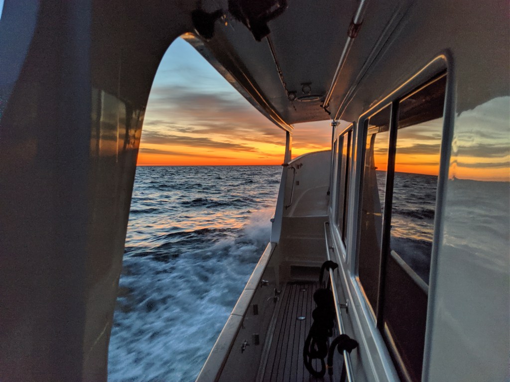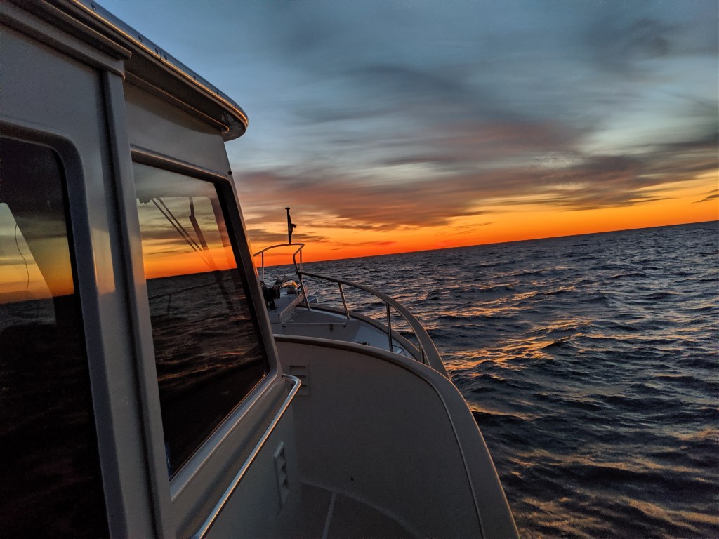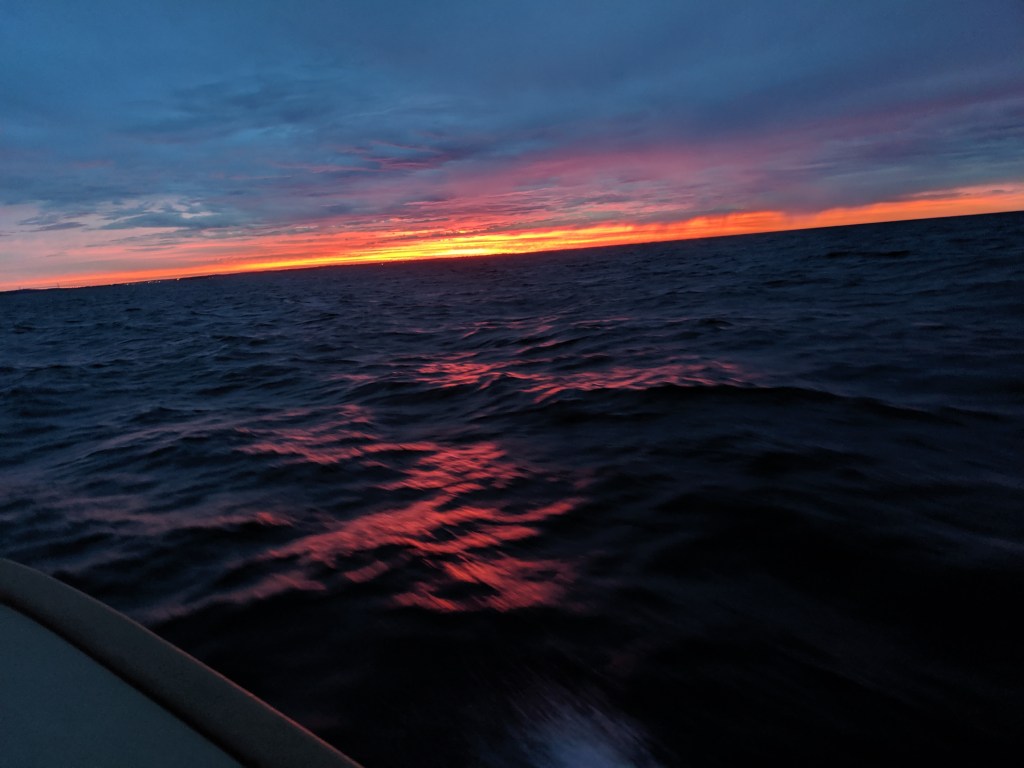 Ray and I Journeyed north with an overnight stop in the upper Delaware bay, tucked in behind Reidy Island, south of Delaware City. We had a small oil leak on the port side inboard valve cover. With an easily replaced gasket we were good to go on to Atlantic City the next day. We then took a direct route to Wickford, RI on an overnight run which included trolling for Tuna. We hooked on to a 46″ blue fin, unfortunately just under the legal limit….only to be returned to sea to grow some more. We had fair weather throughout with a nice sunset and sunrise.